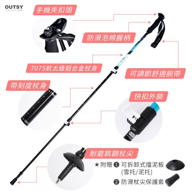 升級版三節伸縮外鎖鋁合金添翼自拍登山杖(三色可選) 附杖尖保護套 泥托