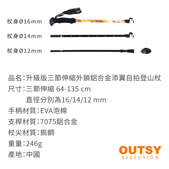 品名:升級版三節伸縮外鎖鋁合金添翼自拍登山杖