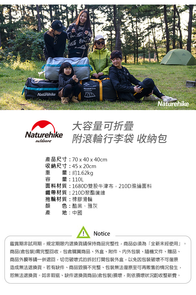 Naturehike 大容量可折疊附滾輪行李袋 收納包 110L